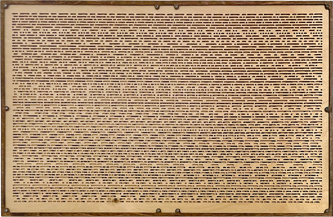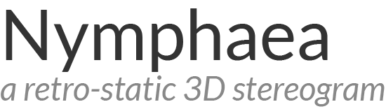 Nymphaea is retro-static art. In the 1990s, it seemed that every shopping mall had a kiosk selling books and calendars of "MagicEye" 3D illusions. These 3D illusions, or stereograms, feature 2D repeating patterns that reveal a 3D image when viewed properly. Nymphaea takes this idea to a new level, incorporating a new type of pattern that can be cut into layers of wood.